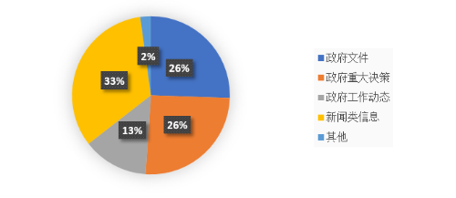 2.通過調查可知,廣大群眾平時關注的信息種類以新聞類信息、政府文件、政府重大決策居多,分別占比33%、26%、26%。