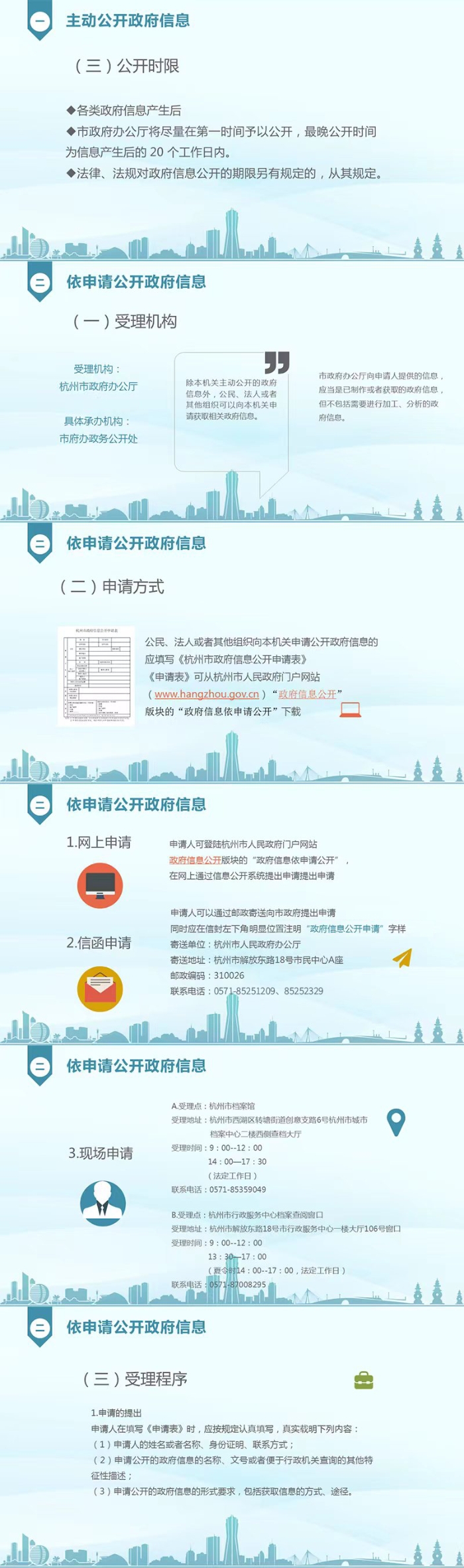 杭州市政府辦公廳是本行政區域的政府信息公開工作主管部門,負責推進、指導、協調、監督全市政府信息公開工作。