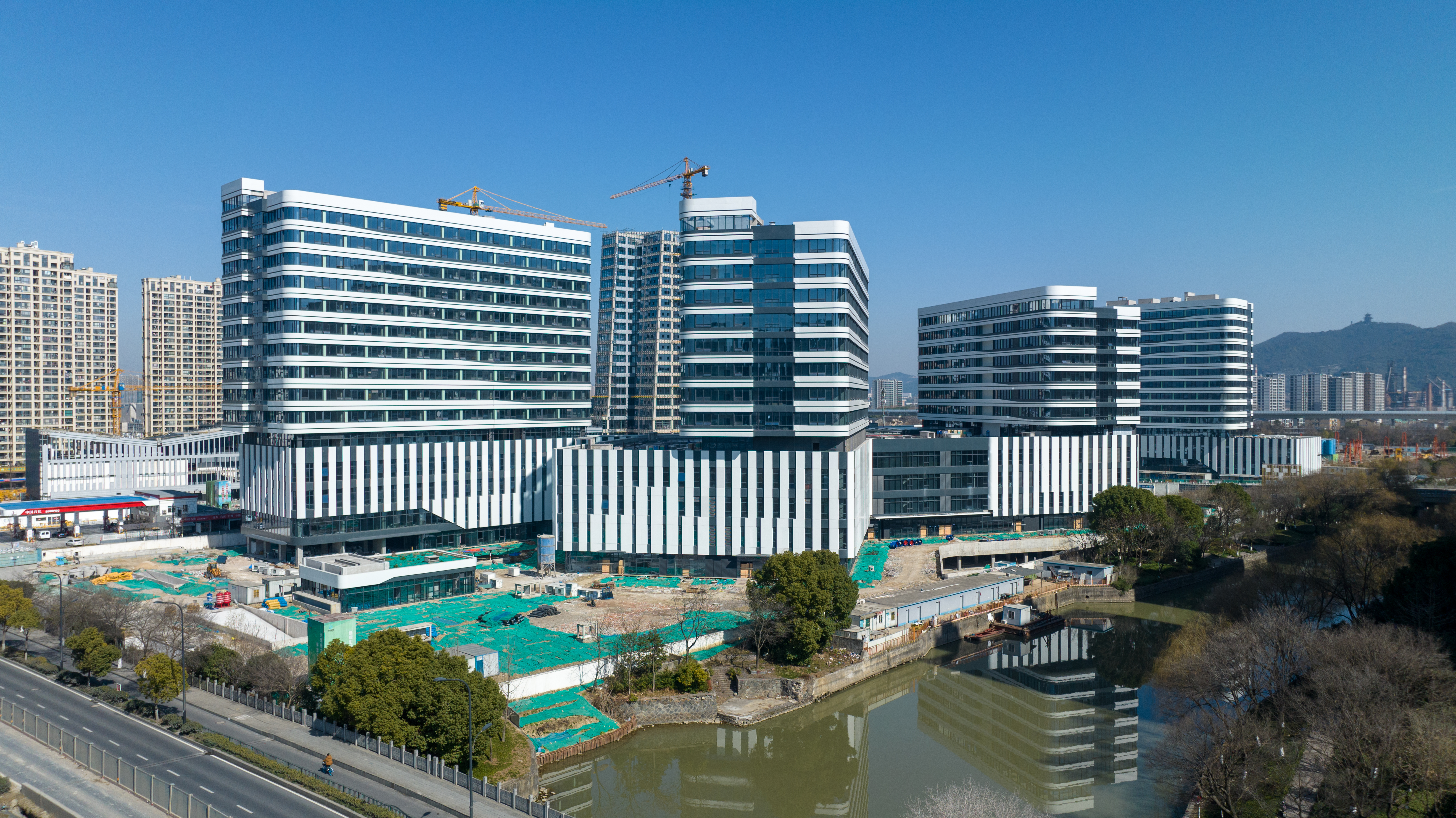 浙江大學醫學院附屬邵逸夫醫院大運河院區位於杭州大城北規劃建設核心區,拱墅區康橋健康產業園內,東至俞家橋河,南至杭鋼河,西至拱康路,北至馬橋路,距離拱宸橋地區僅約5公裏。項目占地麵積75畝,總建築麵積21.4萬方,其中地上建築麵積12.9萬方,總投資16.8億元,建設1200張床位的現代化、國際化的一流三甲綜合性醫院,項目總工期1270天,項目目前主體已完成,正在室內裝修及室外景觀綠化工程施工,項目計劃於2023年12月交付使用。