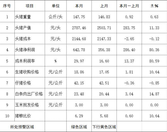 生豬生產成本收益預警區域:綠色區域(價格正常),豬糧比價在6:1-9:1之間;黃色區域(價格中度上漲或中度下跌),豬糧比價在9:1-12:1或5:1-6:1之間;紅色區域(價格重度上漲或重度下跌),豬糧比價高於12:1或低於5:1。