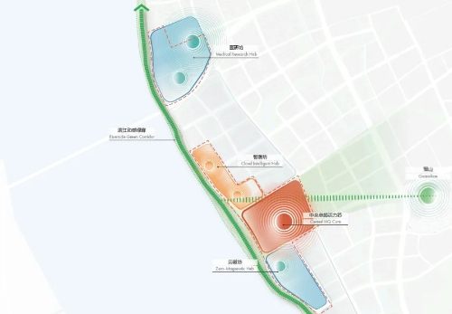 設計方案圍繞“一芯一廊三坊”的功能組織體係展開:“一芯”是中央總部活力核心,彙聚創新與產業的動能;“一廊”是濱江動感綠廊,將生態景觀與公共活動空間巧妙融合;“三坊”分別為“醫研坊”“智醫坊”和“雲磁坊”,通過多元功能分區推動科學研究、智慧醫療及高端科技成果轉化的協同發展,打造一個融合自然、便捷高效且具有區域標誌性的創新綜合體。
